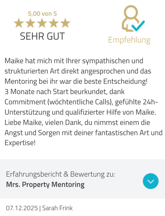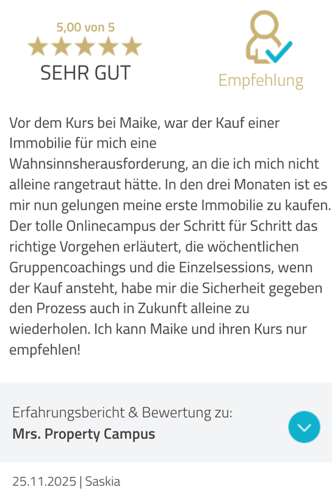 Heute habe ich bereits über 500 Menschen dabei begleitet, ihre erste Immobilie sicher zu kaufen – viele davon besitzen inzwischen ihre zweite, dritte oder siebte.